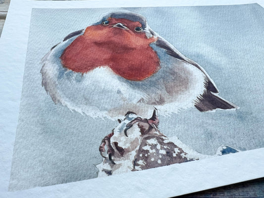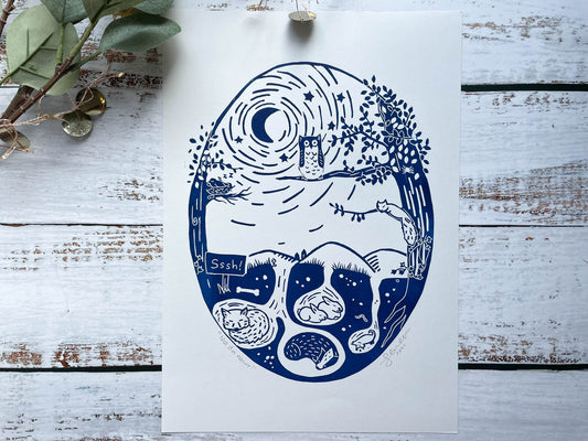 Owl & sleeping animals A4 lino print ‘Nos da Nawr’