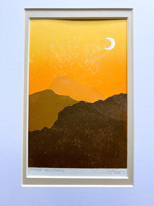 Sunset mountains lino print